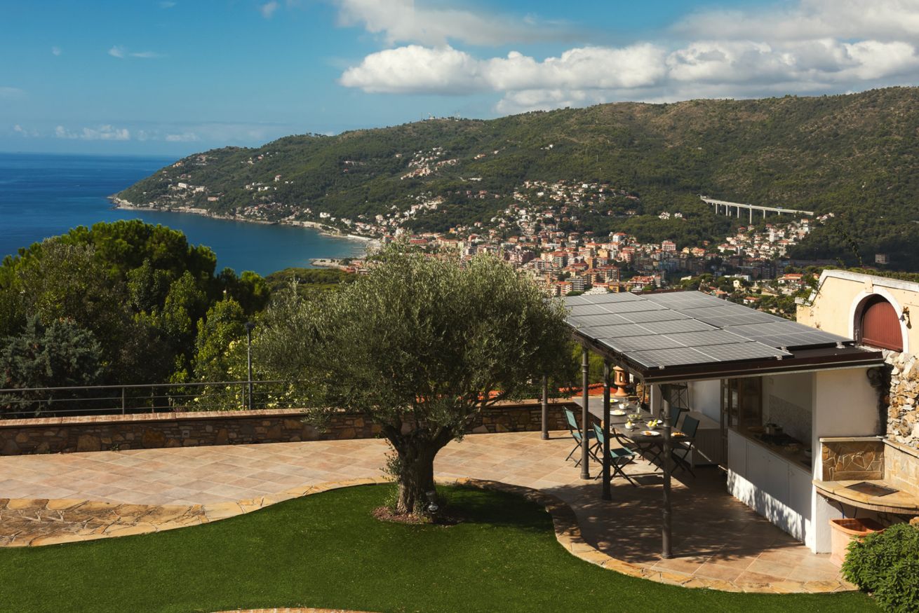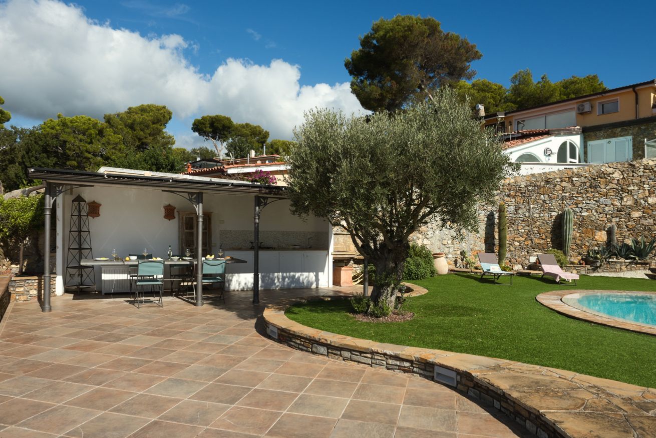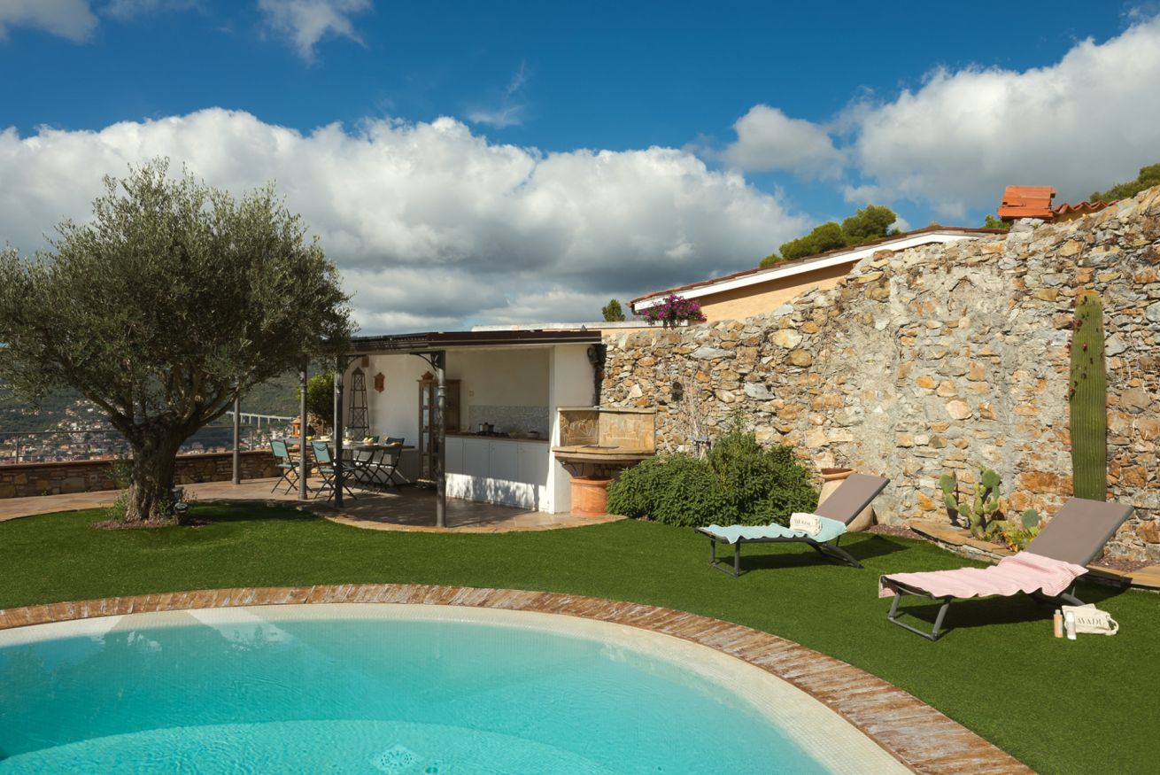 Villa Onde è una villa con piscina ad Andora immersa nel verde mediterraneo della macchia ligure. E ha uno spazio esterno da sogno: zona living in pietra con angolo barbecue per i tuoi pranzi, piscina rotonda per un tuffo al tramonto, giardino ricco di piante come limoni e ulivi e una vista sulla costa e il mare che ti lasceranno senza fiato (e senza memoria sul telefono!).