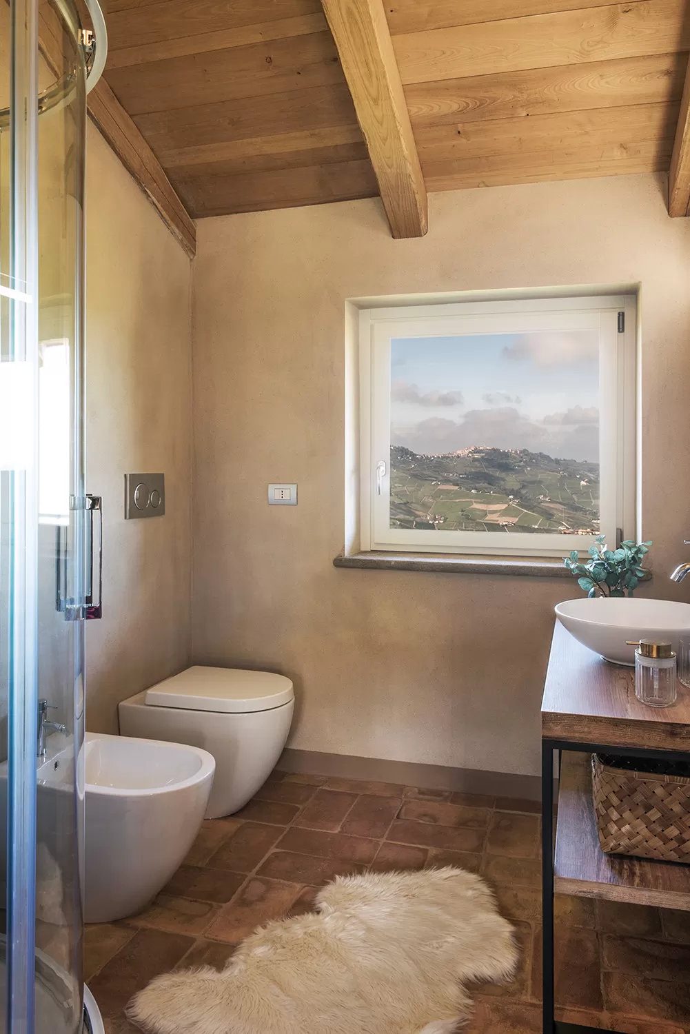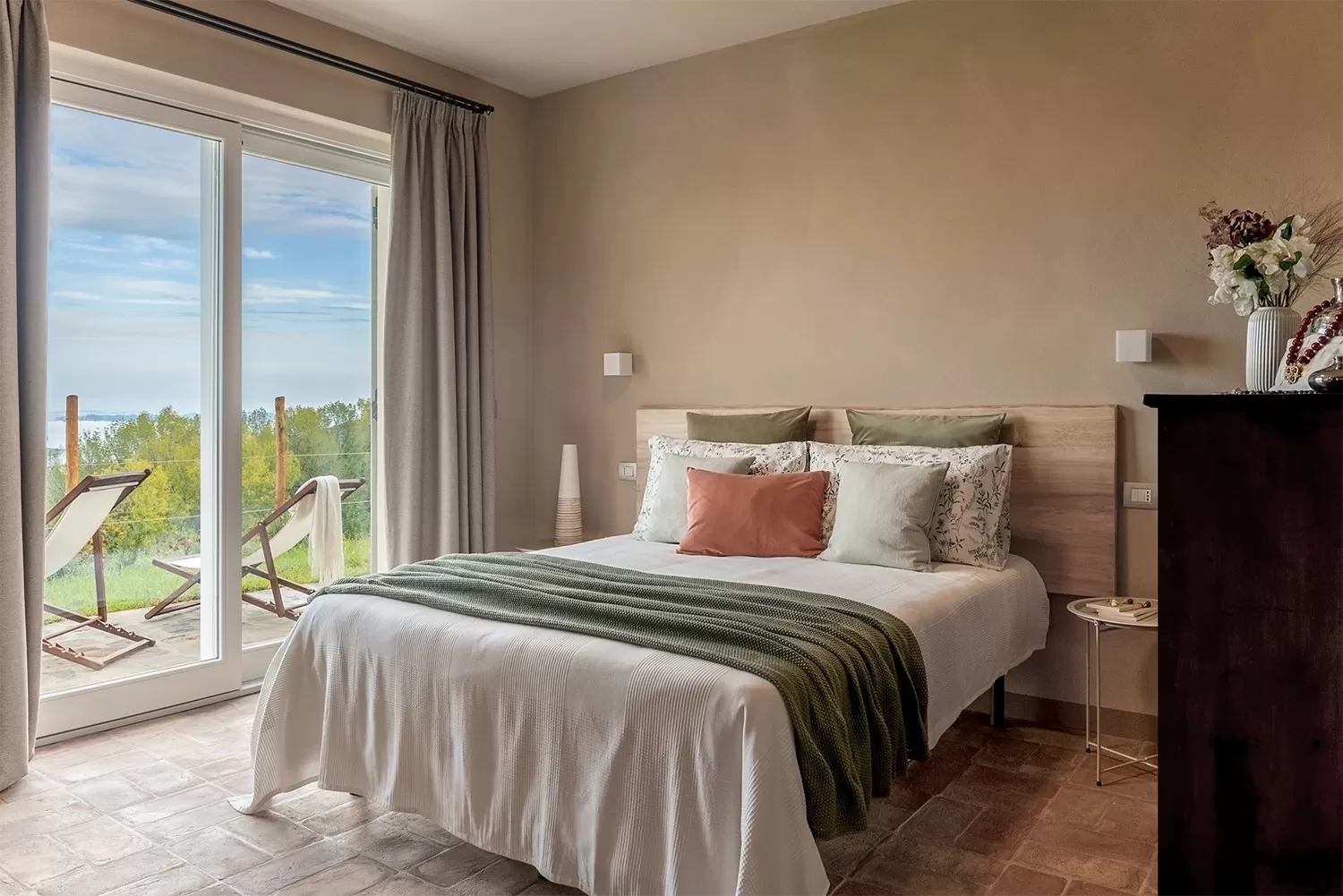 Da qui si accede direttamente alla grande terrazza panoramica: un punto di osservazione privilegiato sulle colline, perfetto per colazioni all’aperto o aperitivi al tramonto.