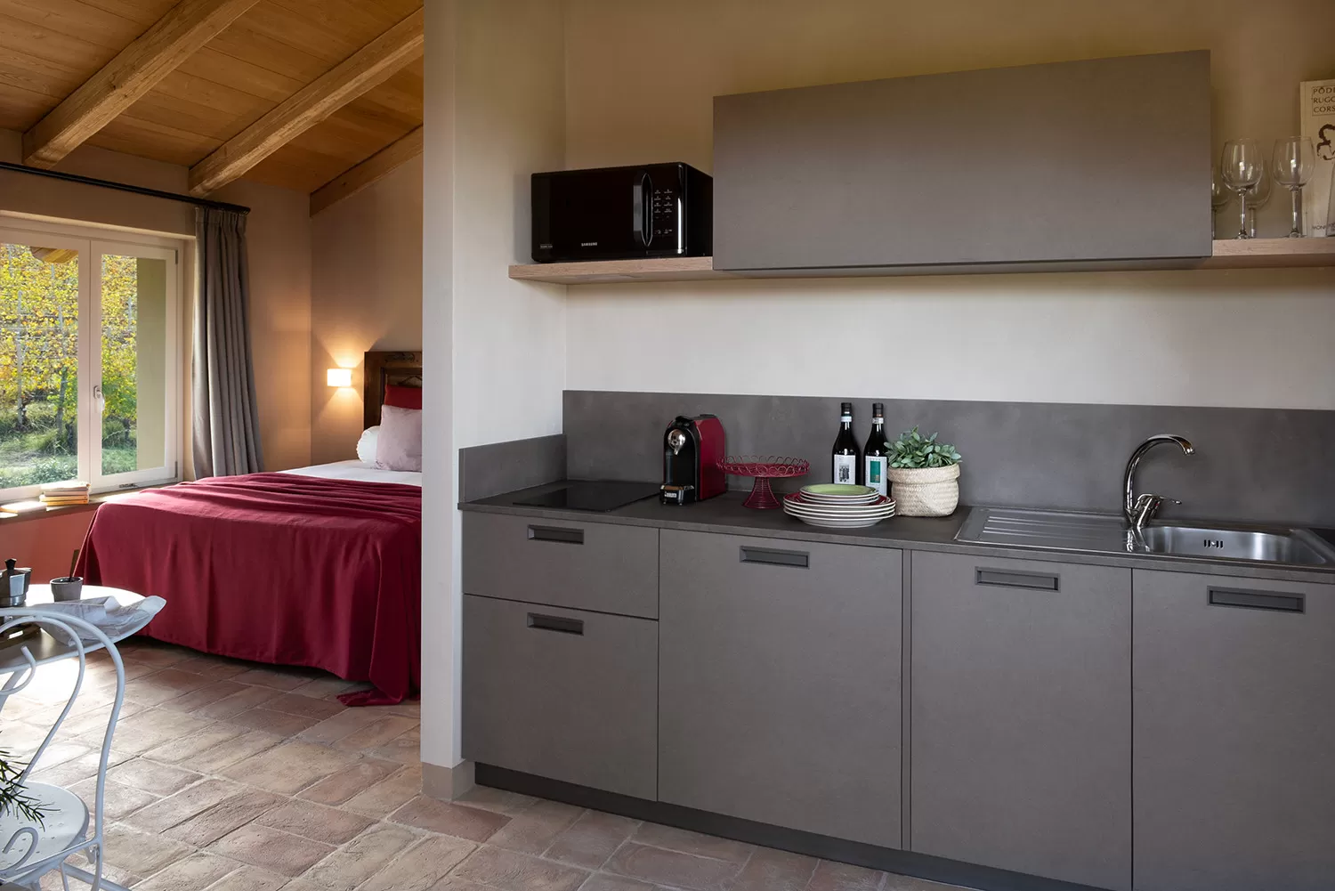 un angolo cottura attrezzato con tutto il necessario per preparare colazioni lente o cene veloci,